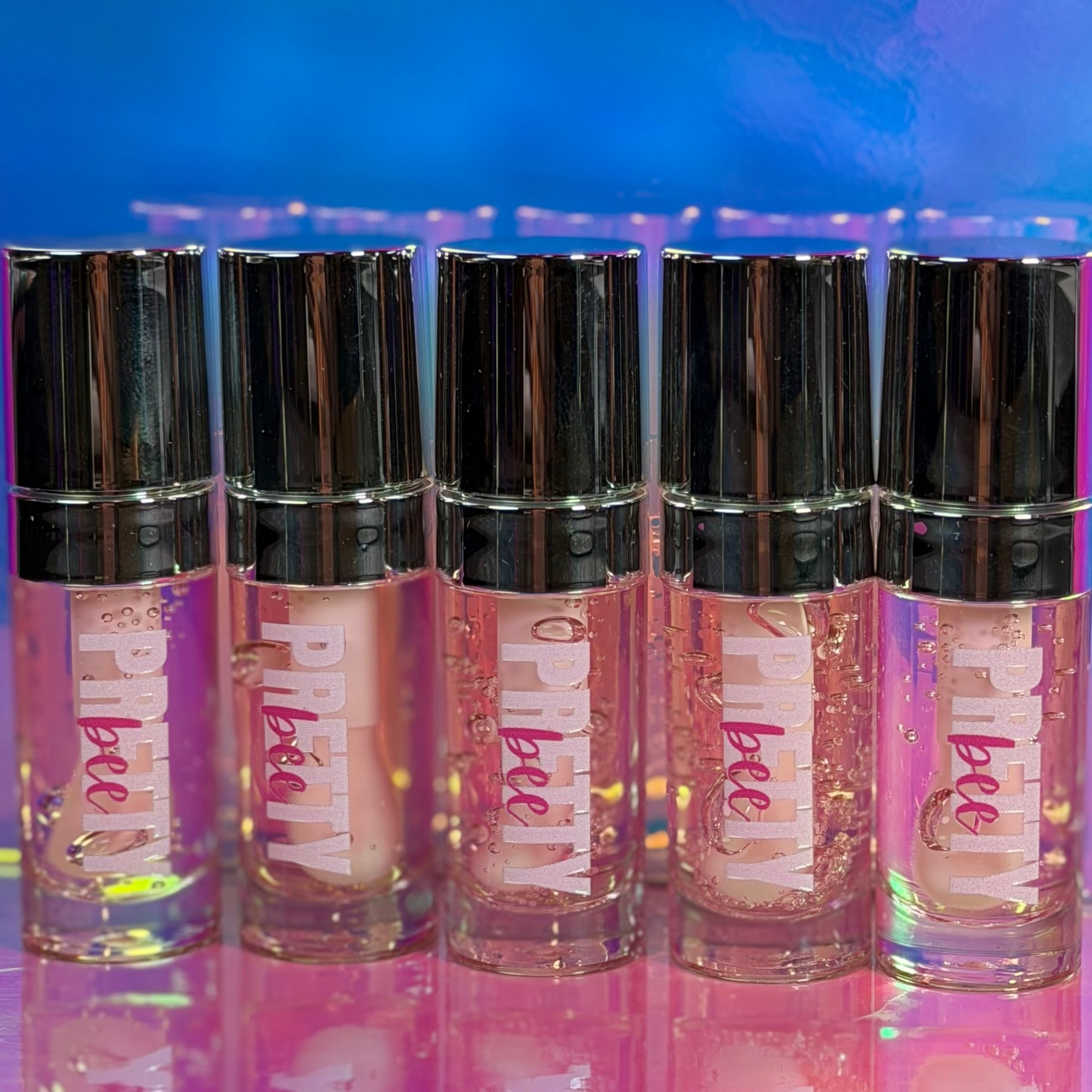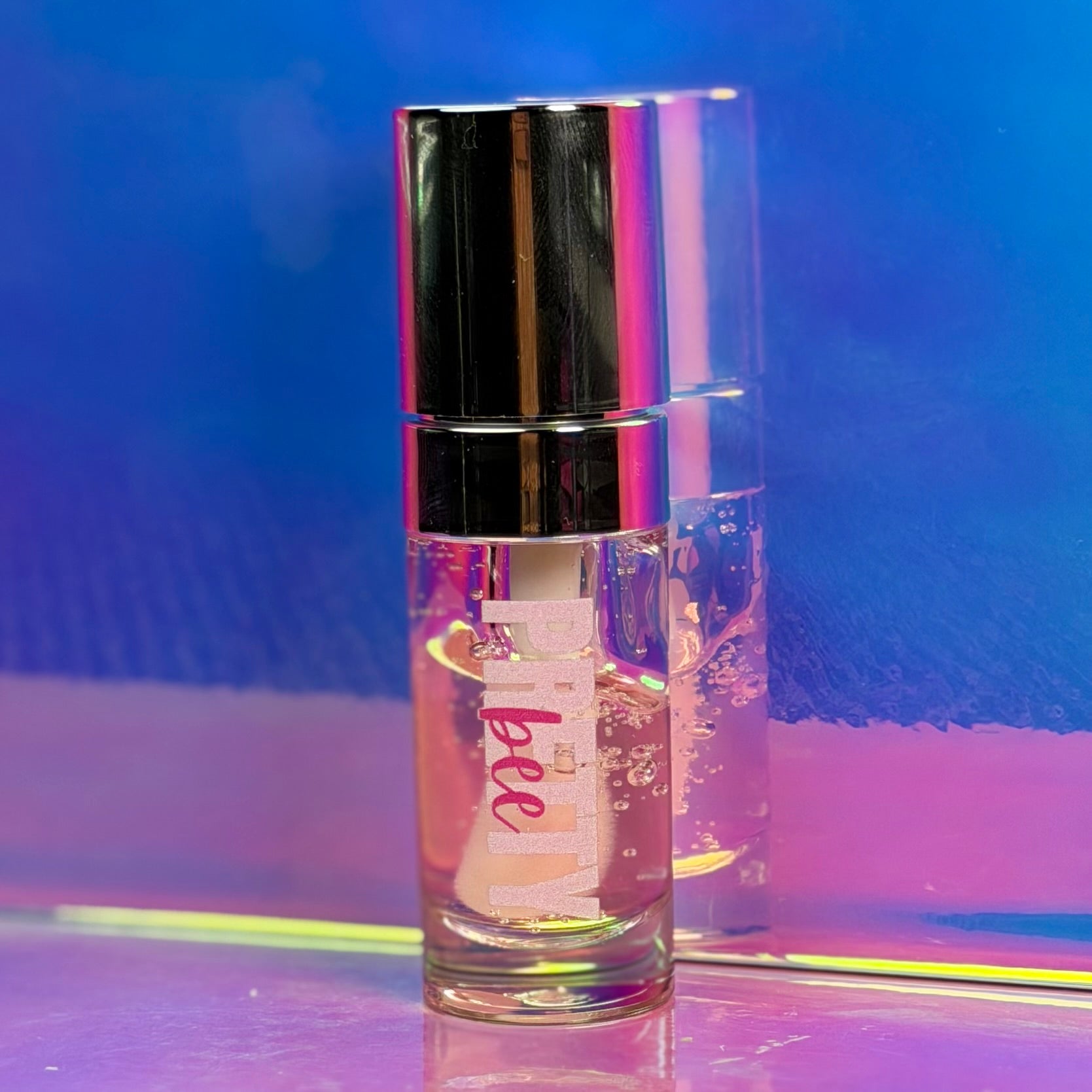 A clear pink lip oil with a juicy shine.